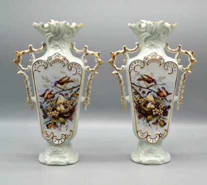 Paar Prunkvasen Biedermeier Vogelnester ca. 24 cm, schöne Porzellanmalerei, ein Standfuß hinten beschädigt