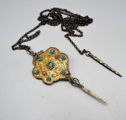 Miederstecker 13 Lot mit versilberter Erbskette u. Stecker, Miederstecker 13 Lot ca. 17 cm (Steine fehlen), Kette mit kleinen Stecker versilbert (beschädigt, provisorisch befestigte Glieder)