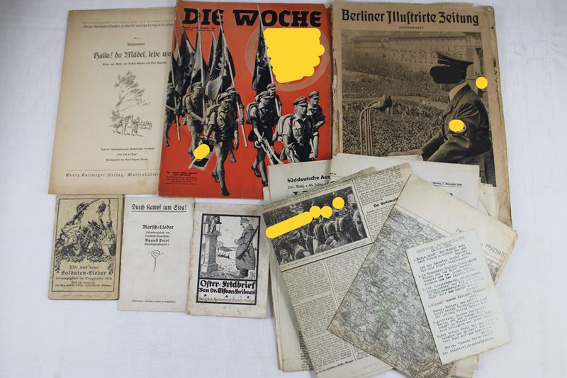 darunter Berliner Illustrierte Zeitung Sonderheft 1938 Wien Österreich (Anfangsseite fehlt), Die Woche Berlin 11. Sept. 1935 Heft 37, Landkarte Vorläufige Ausgabe 1938 Protiwin und Prachatitz, Zeitungsausschnitte Völkischer Beobachter etc., Beschädigungen tlw. vorhanden