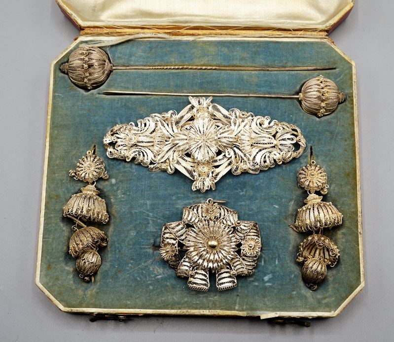 0285-Silberschmuck filigran Haarnadeln Broschen Rosenkranz Kugelkette etc.