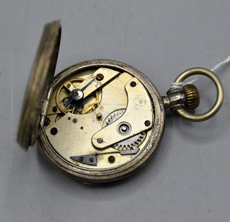 Taschenuhr Schlüssel- und Kronenaufzug Silber, Staubdeckel Metall, früher Kronenaufzug, Deckel gelötet, die Uhr läuft an (Ganggenauigkeit u. Laufdauer nicht geprüft), ohne Schlüssel