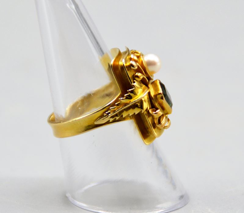 Turmalin Perlen Schmuckset 585 Gold, Goldschmiedearbeit Einzelanfertigung in 585 Gold, Anhänger und Ring jeweils mit facettierten Turmalin und Perle, Ringkopf ca. 19,9 x 13 mm Ring Ø 17,5 mm 6,2 g, Anhänger 33 x 21 mm 8 g, Kette 39,5 cm 3,4 g