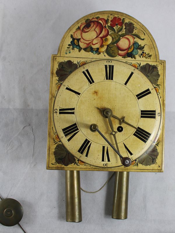 Früher Bauernuhr Schwarzwald 19 Jh., schön bemaltes Zifferblatt, 2 Gewichte u. Perpendikel, Gehfähigkeit nicht geprüft
