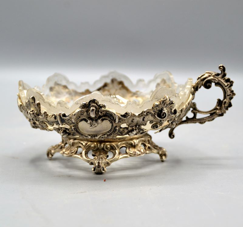 Dessertglasschälchen in Silberfassung um 1900, Glas aufwendig geschliffen mit Rocaillen Blumen etc., ca. Ø 11,5 cm Höhe ca. 5,5 cm