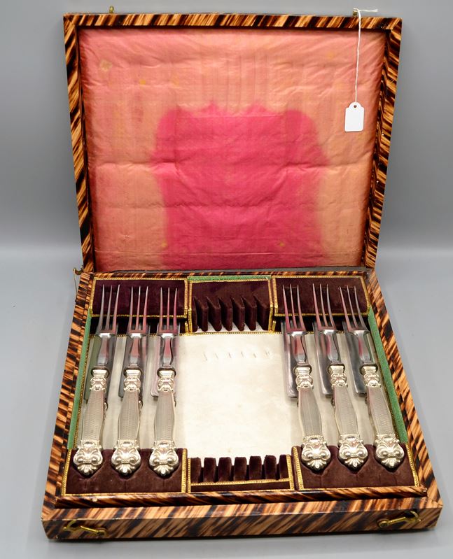 0358-Besteckkasten 6 Gabeln 6 Messer 14 Lot Silbergriffe 19 Jh.