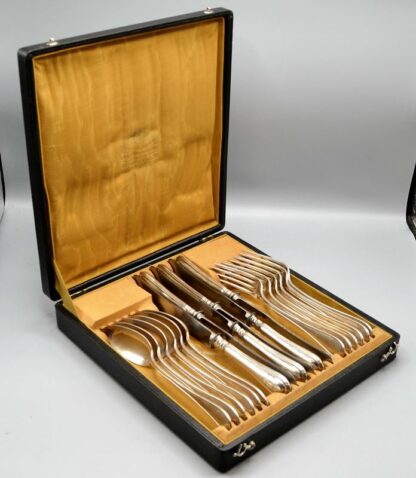Franz Rumwolf K.u.k. Hof-Silberwaren-Fabrikant Silber Besteck um 1900, Monogramm "SH", Diana Kopfmarke 800 Silber gefertigt in Wien, in orig. Schatulle, 18 Teile, Gabel u. Löffel zus. 853 g, Messer zus. 560 g (Messerklingen Schmiedemarke "F RUMWOLF WIEN")