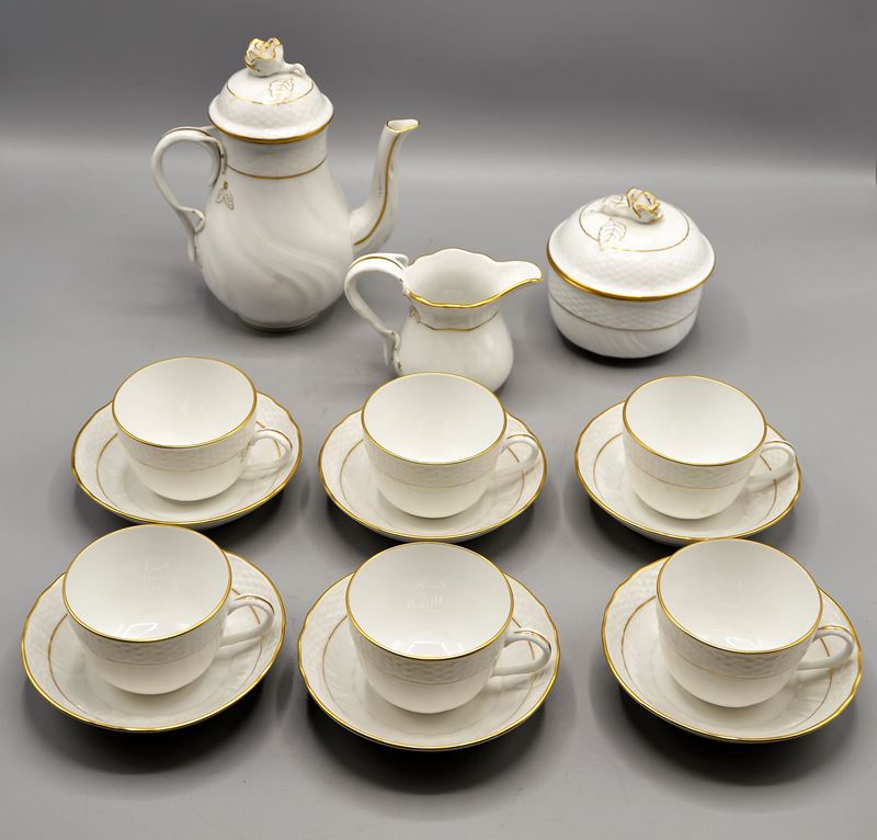 Herend Porzellan Mokka Service 6 Personen 20 Jhdt., 6 Tassen Nr. 1728, 6 Unterteller Nr. 1728 (unbemalt verkauft), Kanne Nr. 1613, Zuckerdose Nr. 1663, Milchkännchen Nr. 1644