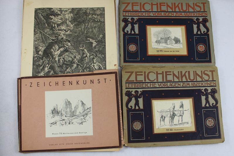 Zeichenkunst Mappe 69, 70 Heft 61, Heft 55 (die Mappen u. Hefte sind nicht vollständig und vermischt mit anderen Blättern!), 6 Ridinger Nachdrucke, Altersspuren/Beschädigungen vorhanden