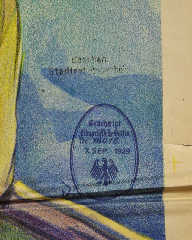 Filmplakat " Frau im Mond" von Fritz Lang 1929, Stempel "Genehmigt Filmprüfstelle Berlin .. 1929", Stempel "Gesehen Polizeidirektion München", Stempel "Gesehen Stadtrat ...", Offsetdruck August Scherl GmbH Berlin SW 68, ca. 141 x 95 cm, Knickfalten, vereinzelt Risse an den Rändern, kleine Löcher überw. im Bereich der Knickfalten