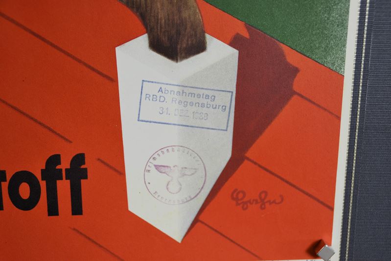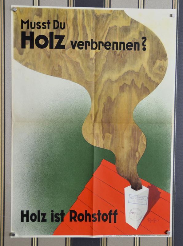 Plakat "Musst Du Holz verbrennen? Holz ist Rohstoff" 1938, Herausgeber: Arbeitsgemeinschaft Holz und Reichsarbeitsgemeinschaft Schadenverhütung, Stempel Reichsbahndirektion Regensburg u. "Abnahmetag RBD. Regensburg 31. Dez. 1938", ca. 59 x 42 cm, Knickfalten