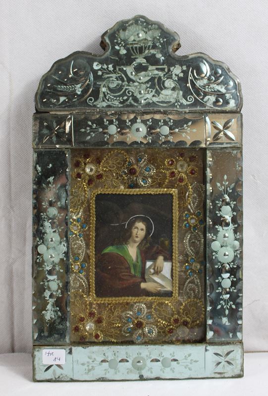 Klosterarbeit koloriertes Andachtsbild aufwändig geschliffener Spiegelrahmen 19 Jh., Gold- und Silberdrahtarbeiten, Farbsteine, ca. 30 x 17 cm