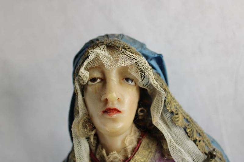 Wachskopf mit Glasaugen, 1 Finger beschädigt, Kleidung mit Altersspuren/Beschädigungen, ca. 55 cm