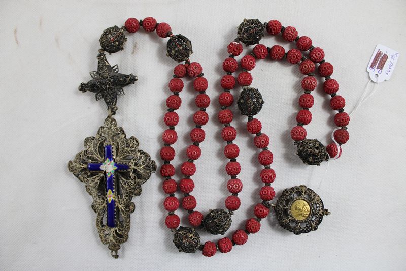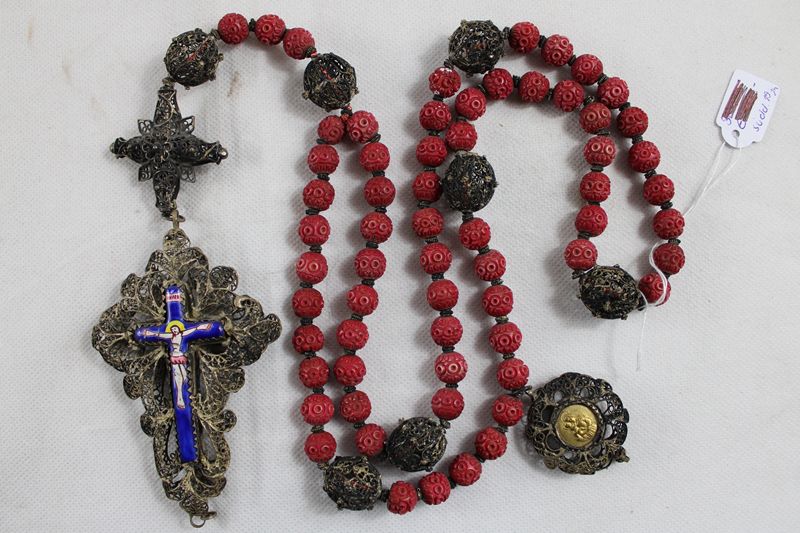 Großer Filigranrosenkranz geschnitzte rote Perlen süddeutsch 19 Jh.