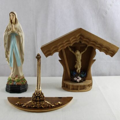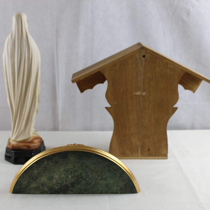 darunter ein Wegekreuz, Lourdes Madonna Resin, geschnitzter Wandsockel