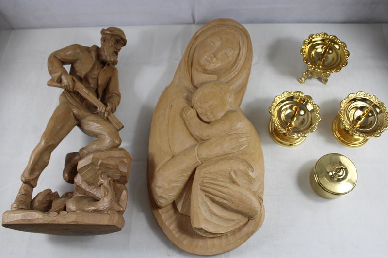 darunter großes Madonnenrelief ca. 59 cm, Schnitzfigur Jäger ca. 50 cm, vergoldete Objekte (tlw. beschädigt)