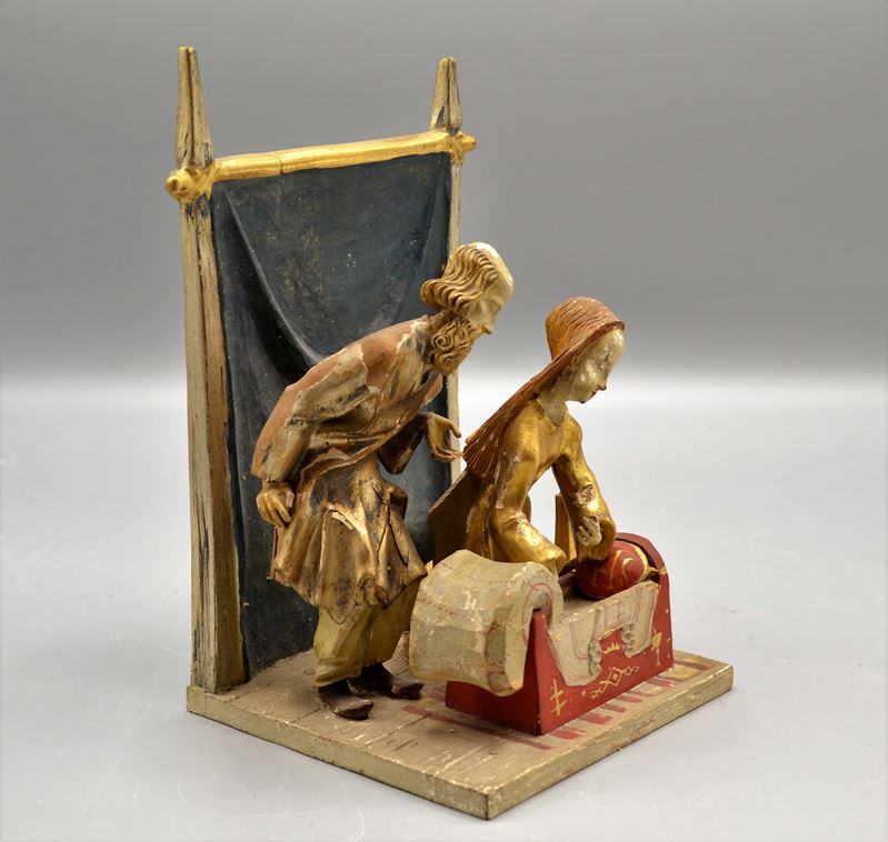Krippe Schnitzfiguren Anfang 20 Jhdt., Signatur in der Bodenplatte, feine Miniatur Schnitzerei, Kindlein fehlt, Finger beschädigt, ca. 17,5 x 11 x 11 cm (H x T x B)