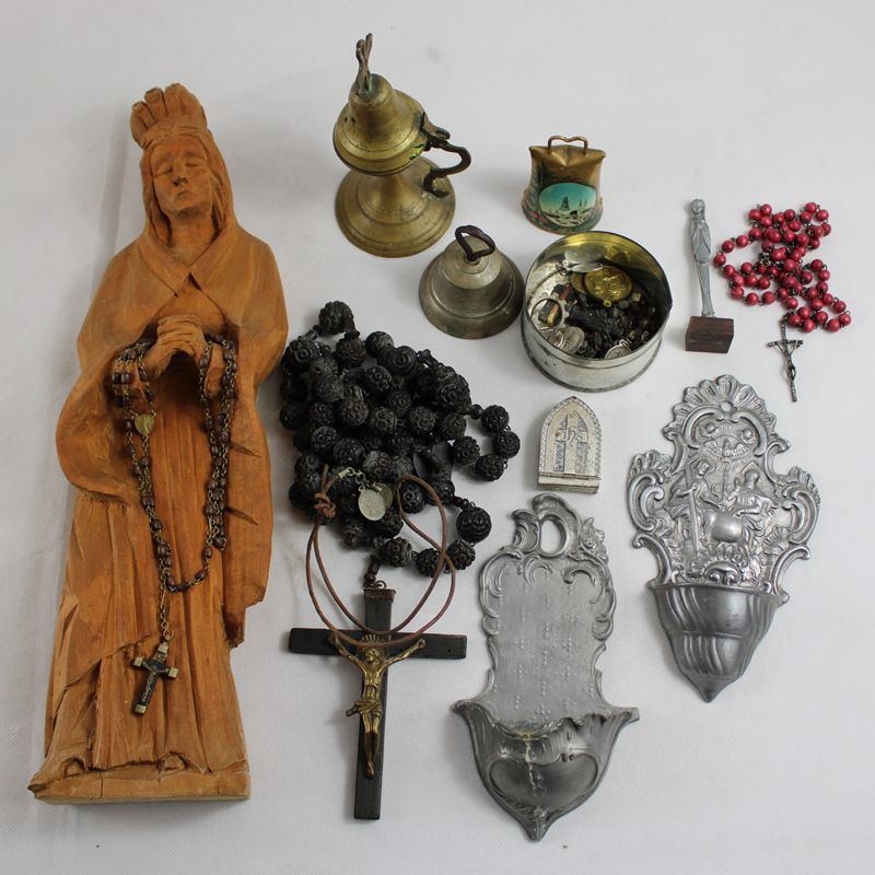 darunter Weihwasserbehälter, Rosenkränze, Madonna, Heiligenanhänger etc.