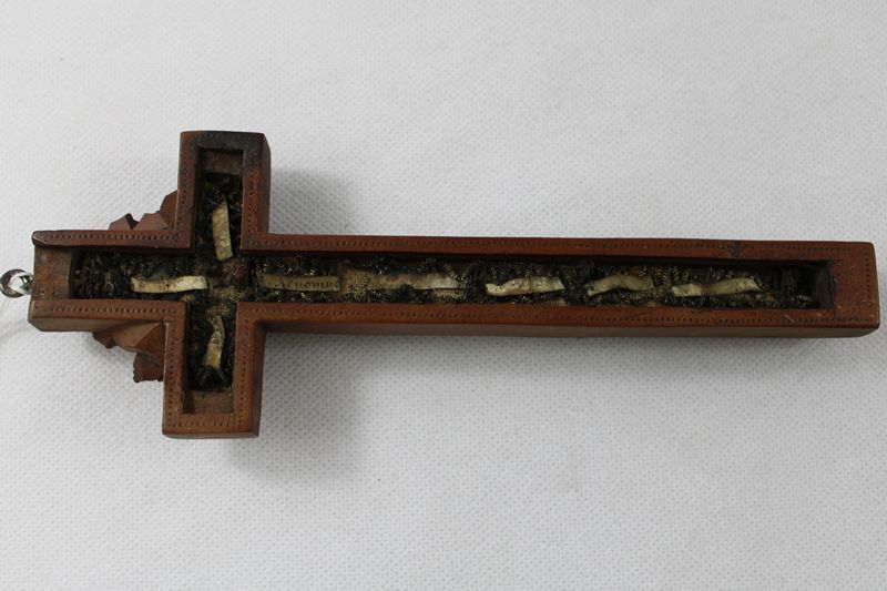 Reliquien vorhanden, rückseitige Schiebedeckel ergänzt, kleiner Riss am oberen Kreuzende durch eingeschraubte Öse, ca. 19,5 cm
