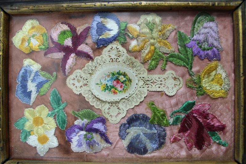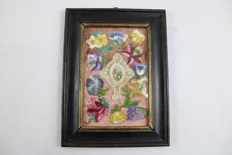 0437-Klosterarbeit mit Blumenstickereien u. Spitzenkreuz um 1900