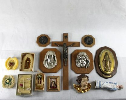 Religiöses Konvolut ca. 14 Teile, darunter geschnitzter Puttokopf, Wachsstöckl, Porzellan Jesus, Madonnen Jesus Reliefs etc.