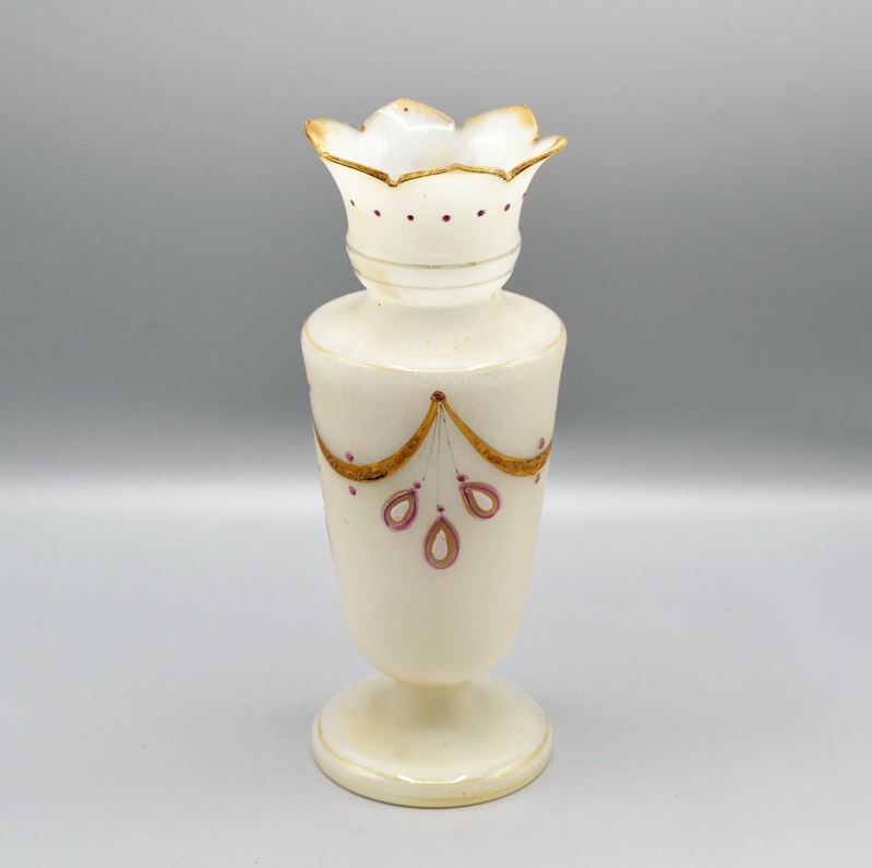 Alabasterglasvase um 1880, Rand gebogt geschliffen, reiche pastose Goldmalerei, ca. 24,5 cm