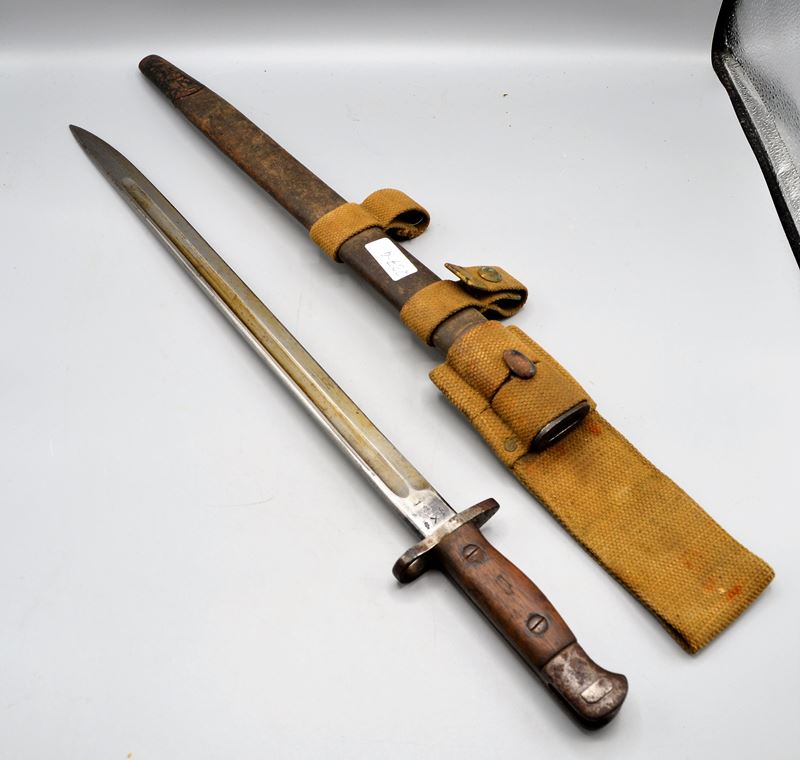 Wilkinson Bajonett Pattern 1907 England hergestellt 1915 mit Lederscheide u. seltenem Koppelschuh, Flugrost, Abgabe nur gegen Altersnachweis!