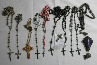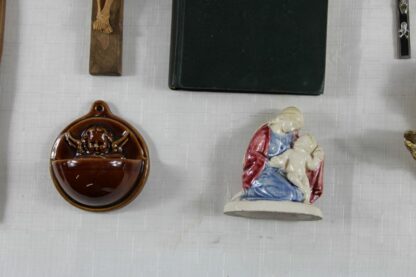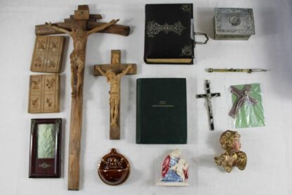 darunter geschnitzte Kruzifix, Göbel Weihwasserbehälter, Fotorahmen etc., tlw. Beschädigungen vorhanden