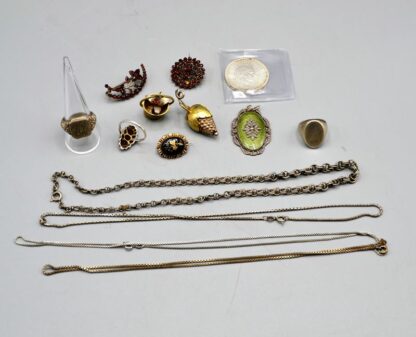 Konvolut überwiegend Silberschmuck 14-teilig darunter 4 Silberketten, 3 Silber Anhänger, 3 x Granatschmuck, 10 € Gedenkmünze Silber 2005, 2 Siegelringe Silber etc., kleine Beschädigungen können vorhanden sein