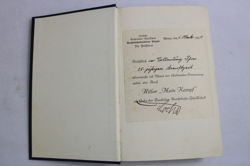 mit Widmung der deutschen Reichsbahn-Gesellschaft zum 25-jährigen Dienstjubiläum, 123.-124. Auflage Zentralverlag der NSDAP Frz. Eher Nachf. München, leichte Altersflecken am Buchschnitt