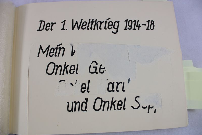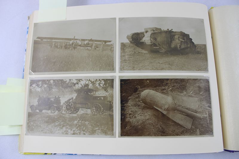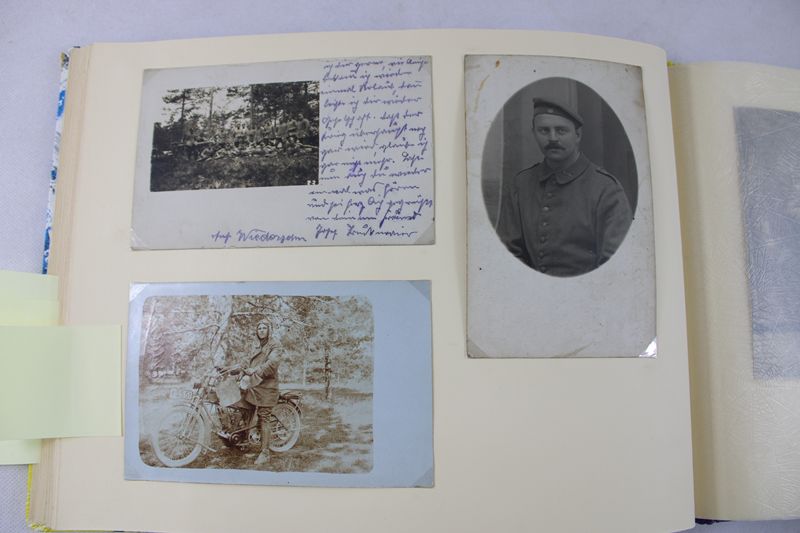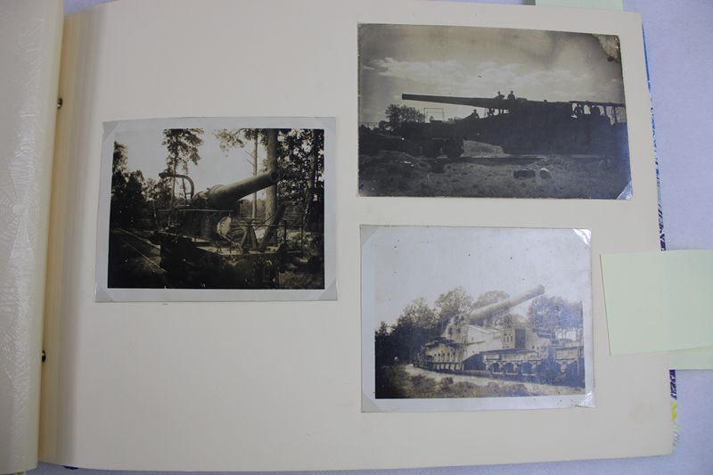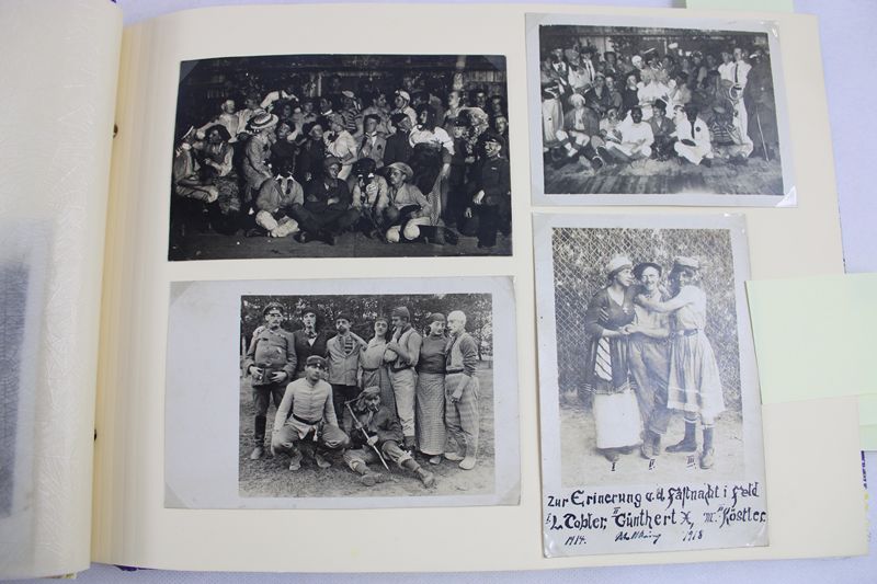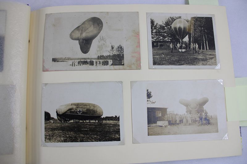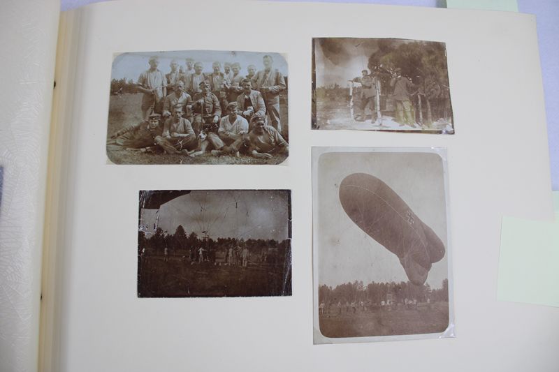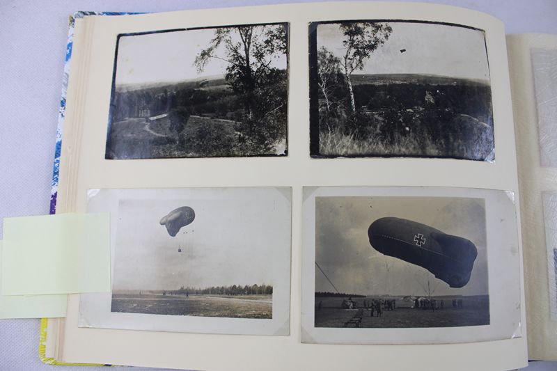 insgesamt ca. 114 Fotos eingesteckt, darunter einige Fotos von Fesselballons u. Luftschiffer, Fastnacht im Feld mit verkleideten Soldaten, Eisenbahngeschütz, 1 Foto mit Motorrad, abgestürztes Flugzeug, 1 Foto mit Panzer, Lazarettaufnahmen und vieles mehr