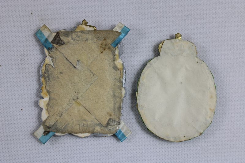 diese kleinen Medaillons befanden sich wohl auf Konfekt dass zu feierlichen Anlässen an die Gäste verteilt wurde, ca. 7,8 x 5,6 cm und 8,5 x 6,2 cm, kl. Beschädigungen