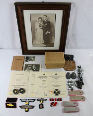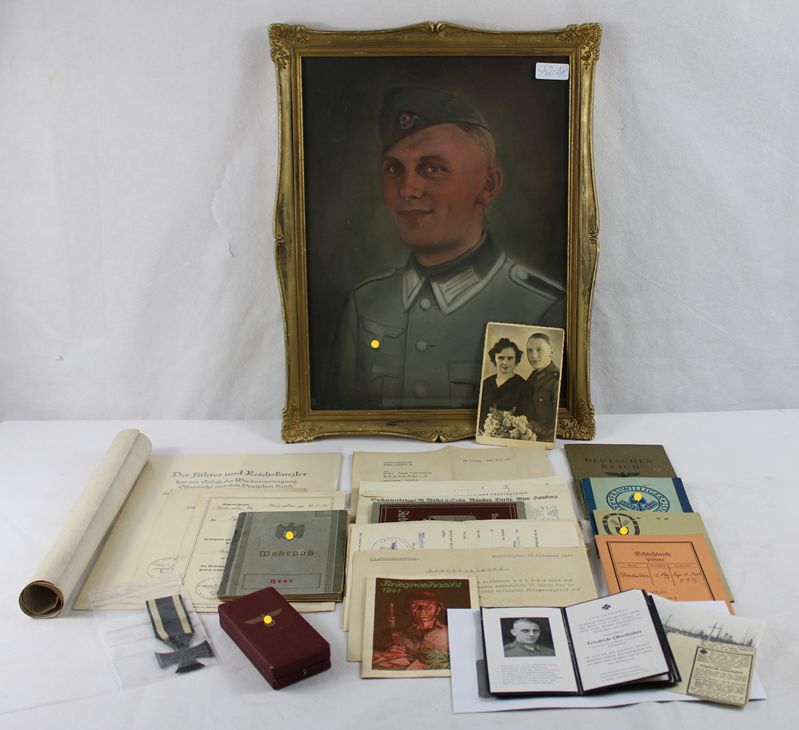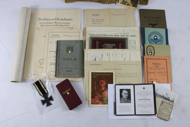 darunter Wehrpass, Schiessbuch Pistole, Arbeitsdienstpass, Arbeits Dank Mitgliedskarte, Deutsches Reich Reisepass, Führungszeugnis 1938, Bescheinigung der Schutzpolizei über Fliegerangriff auf ein Anwesen 1942, Verleihungsurkunde Medaille zur Erinnerung an den 13. März 1938, Verleihungsurkunde Medaille zur Erinnerung an den 1. Oktober 1938, Eisernes Kreuz 2. Klasse mit Verleihungsurkunde vom 21. März 1943 (posthum), 9 Sterbebilder, Foto Soldatenfriedhof, Schreiben des Wehrmeldeamtes zur Übersendung des Wehrpasses, Beileidsschreiben des Arbeitgebers Buchgewerbehaus M. Müller & Sohn München mit Übersendung des Heftes "Heimat und Front" darin 1 Seite dem Gefallenen gewidmet, Arbeitsbuch der Ehefrau, Heirats-Erlaubnisschein, gerahmtes Soldatenbild, Erinnerungsurkunde an die erste Dienstzeit bis 1938, Etui für Mutterkreuz (ohne Orden), Eisernes Kreuz 2. Klasse erster Weltkrieg ! (wohl von einem anderen Verwandten, nicht zugehörig) etc.