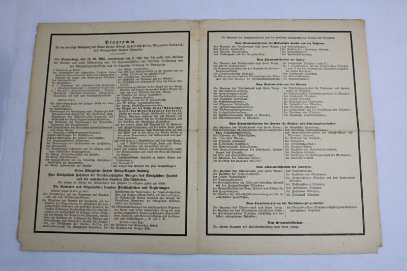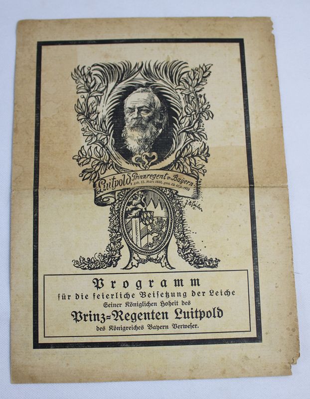 "Programm für die feierliche Beisetzung der Leiche Seiner königlichen Hoheit des Prinz-Regenten Luitpold des Königreiches Bayern Verweser.", Druck und Verlag von Carl Aug. Sehfried & Comp. München, darin enthalten die genaue Aufstellung des Trauerzuges und der Ablauf der Leichenfeierlichkeiten, Flecken, Knickfalte, kleine Beschädigungen an den Rändern, ca. 32 x 23,5 cm