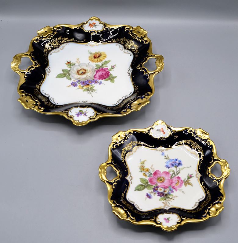 Alka Kunst Porzellan Prunkschalen kobaltblau Goldrand Blumen 2 St., ca. 21 x 21 cm u. 32 x 31 cm
