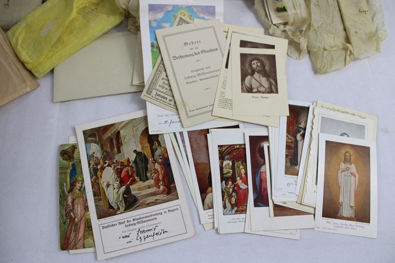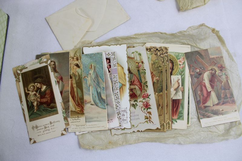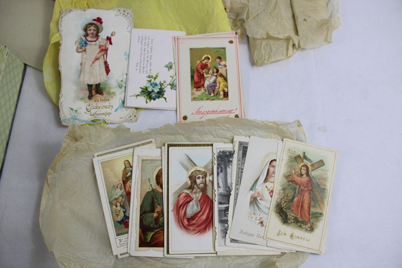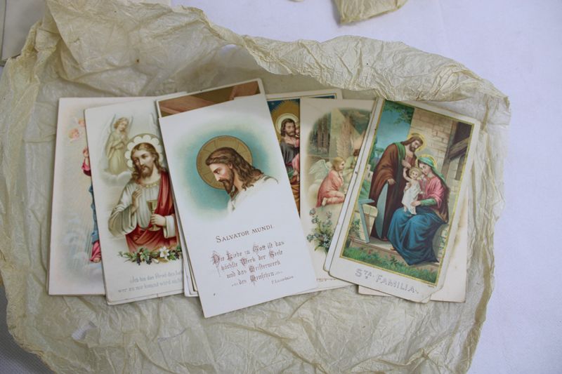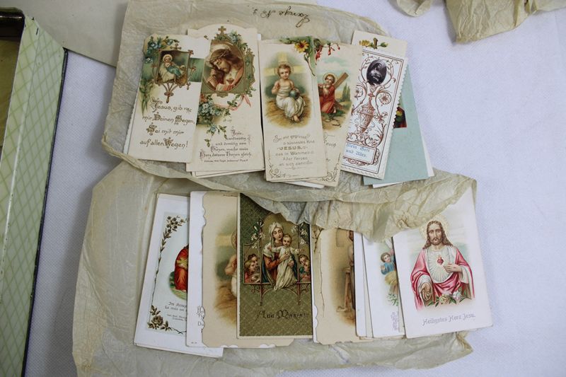 Blechdose voll alter Andachtsbilder um 1900 / frühes 20 Jh.