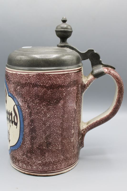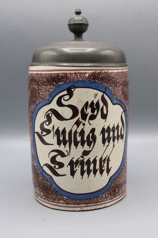 0528-Fayence Walzenkrug mit Spruch um 1800