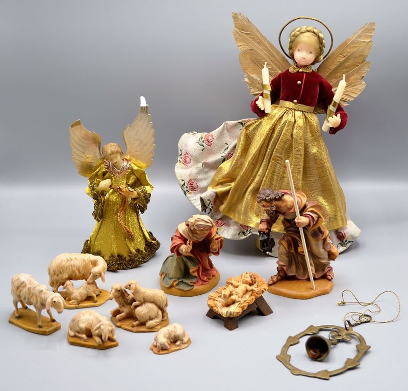 Krippe Weihnachtskrippe klein Südtirol Schnitzfiguren 8-teilig (Josef ca. 12 cm Maria ca. 9 cm) dazu noch zwei alte Wachsengel