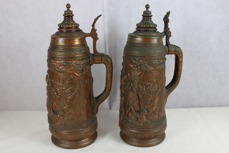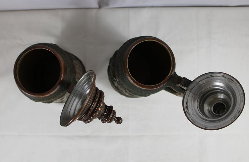0549-Paar 3 L Steinzeug Krüge kupferummantelt 19 Jh.