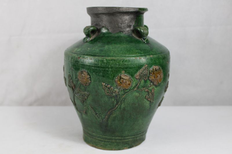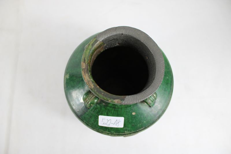 Steinzeug grün glasiert, mit floralen Motiven, oben eine alte Zinnrestaurierung, Höhe ca. 23 cm, Altersspuren