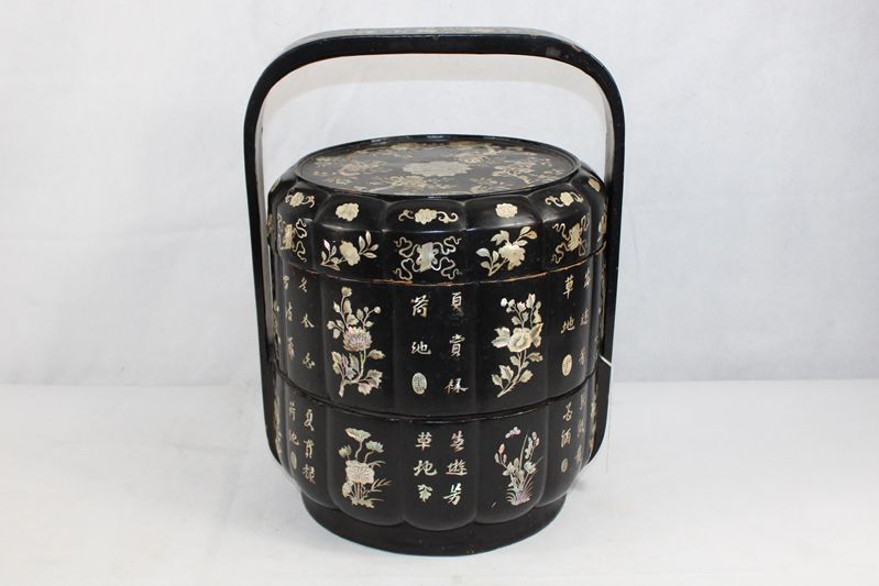 Holz mit schwarzem Lack, Intarsien zeigen Blumenmuster und chinesische Schriftzeichen, oberster Deckel mit geklebten Bruch, Altersspuren, Höhe ca. 27 cm (ohne Griff), Ø ca. 25 cm