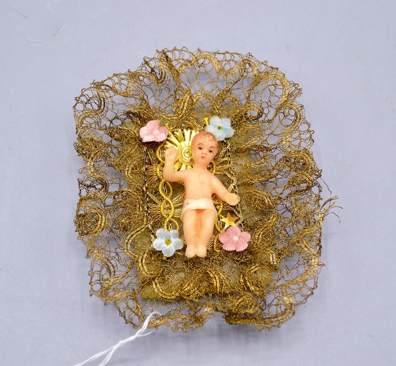 Wachs Jesulein auf fein durchbrochenen Goldbrokatkissen ca. 10 x 8 cm