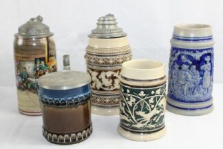 darunter ein Krug mit Metzger Zunftdeckel, Mini Krüglein mit Münchner Kindl, 2 Krüge beschädigt