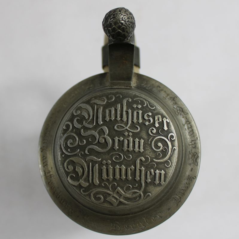 Zinndeckel von H. Dietsch München mit Schriftzug Mathäser Bräu München u. gravierter Widmung mit Datierung 1907