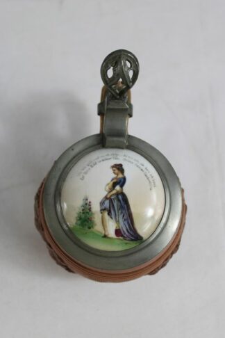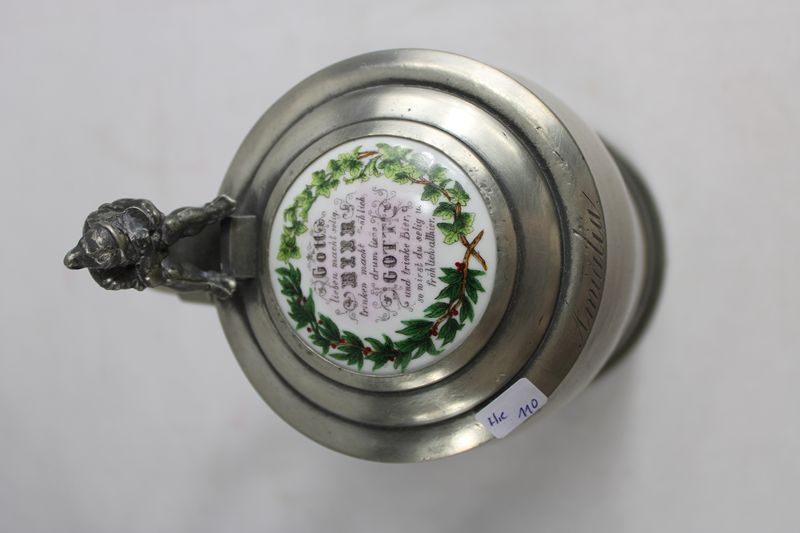 figürlicher Deckelheber Zwerg, gekämmte Wandung, Zinndeckel mit Porzellaneinlage und Inschrift "Amicitia"