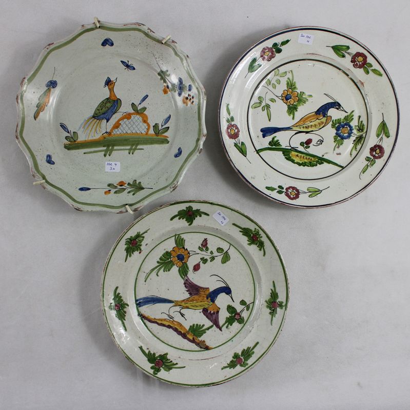 Alte Fayence Teller bemalt mit Vögeln u. Blumen Konvolut 3 St.
