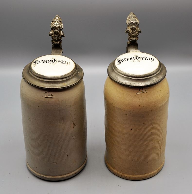 0610-Keferloher Bierkrüge 1 L Paar Lorenz Grätzl Steinzeug um 1900