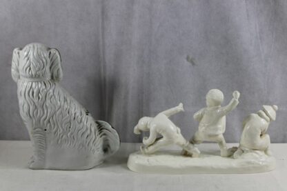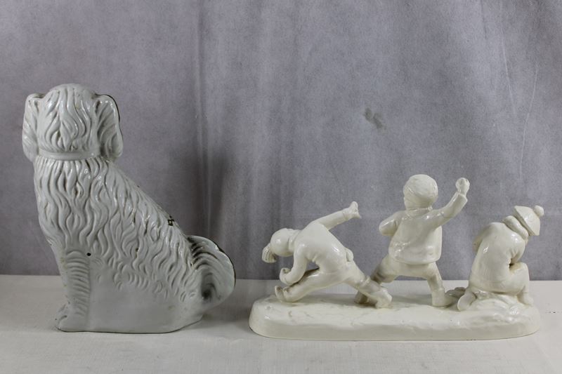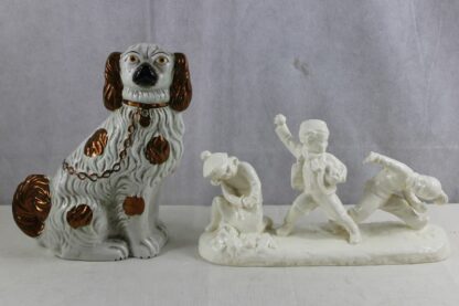Figurengruppe ca. 36 cm (1 Arm restauriert), Kaminhund ca. 29 cm