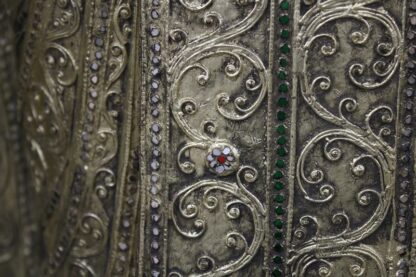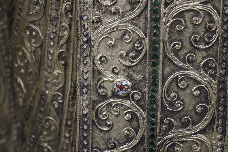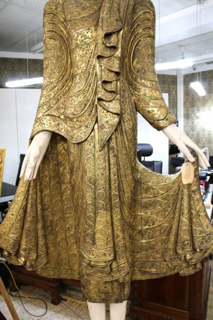 Lebensgroßer Gautama Buddha spätere Mandalay-Epoche Myanmar 2. H. 19 Jh., ca. 2,53 m (ohne Sockel) ca. 2,70 m (mit Sockel), Holz geschnitzt, lack- u. blattgoldgefasst, beeindruckende Größe, insgesamt guter Erhaltungszustand, altersbedingte Risse u. Lackabplatzungen, am rechten äußeren Gewandsaum Bestoßung m. Fehlstelle, mit Wertfeststellung/Gutachten in Kopie eines öffentl. best. u. vereid. Sachverständigen f. Gegenstände der ostasiatischen Hochkulturen von 02/2009