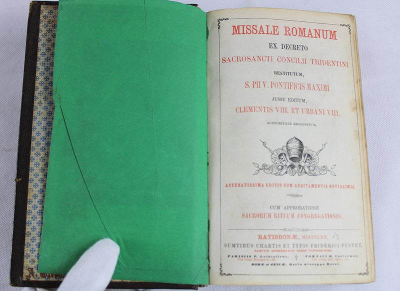 Missale Romanum Messbuch Regensburg 1862, in lateinischer Sprache, Verlag Friderici Pustet, Vorsatzblatt fehlt, kl. Beschädigungen vorhanden