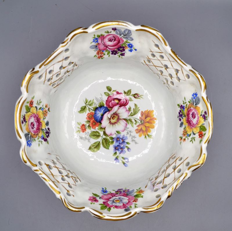 Obstschale Prunkschale Porzellan 20 Jhdt., unbekannte Marke "Krone D 1854", ca. 21,5 cm, Ø oben ca. 22,8 cm